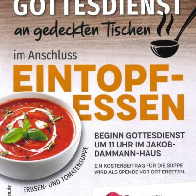 Das Eintopfessen ist eine Traditionsveranstaltung in St. Martini. Viele haben das Eintopfessen im letzten Jahr schmerzlich vermisst, dabei ist es nicht wirklich ausgefallen, es hat nur, wegen der Vielzahl der Veranstaltungen im Advent, einen anderen Ort bekommen und einen anderen Namen. Auch in 2026 wollen wir das traditionelle Eintopfessen fortsetzen: Am Sonntag, den 25. Januar...